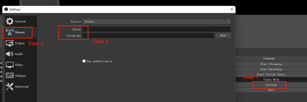 Open the platform you want to stream and get the platform’s URL for Sever and Stream key for Stream Key.