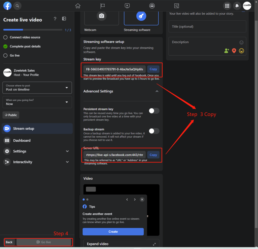Click on the Facebook page in sequence as the picture shows and get your Stream Key and Stream URL, which are essential to stream set-ups on Facebook.