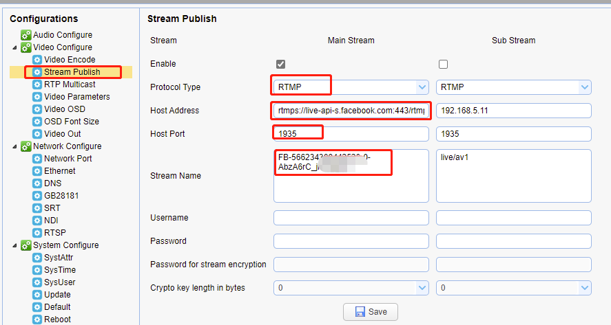 Go to Configurations>Video Configure> Stream Publish and use the information from Facebook to set up your stream.