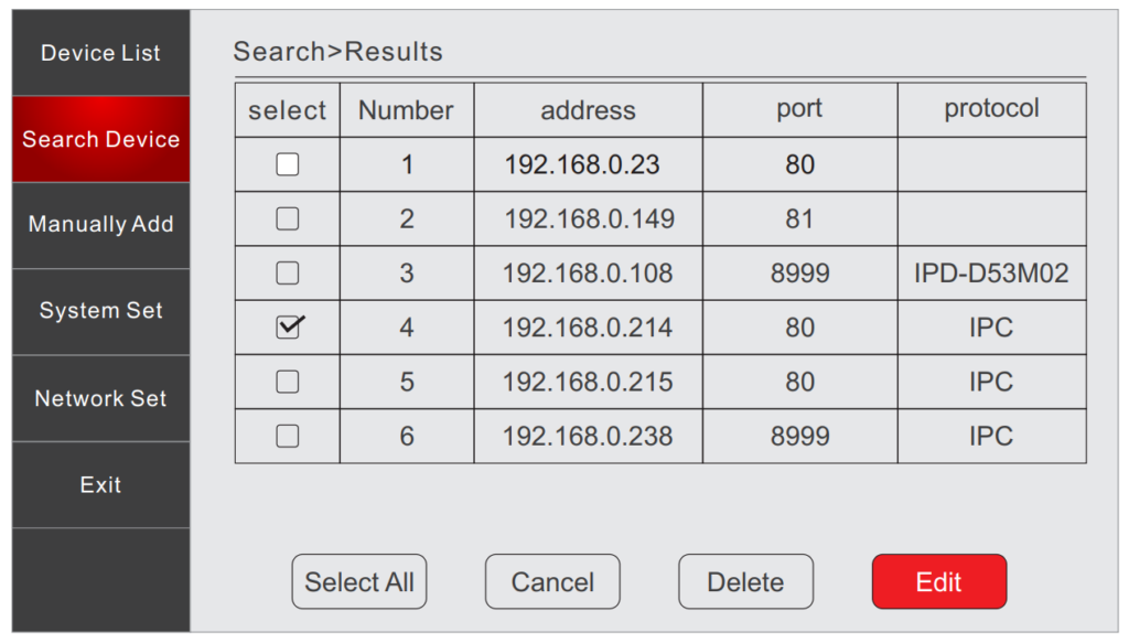 (1) Press <SEARCH> to the search device, move the red cursor to the right to jump into the search, press the middle button of the joystick to confirm the search for the device, select the device to be added, press OK, and then move the red cursor to New.