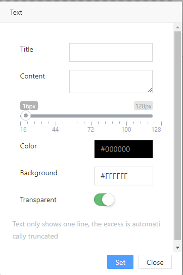 ⊕Text After clicking “⊕Text” button, the “Text” window will pop up on the page for the user to edit the text OSD that Includes “Title”, “Content”, “Font size”, “Color” and “Background color”. The background will be transparent when switching the “Transparent switch” button on. At last, click “Set” button to apply it.