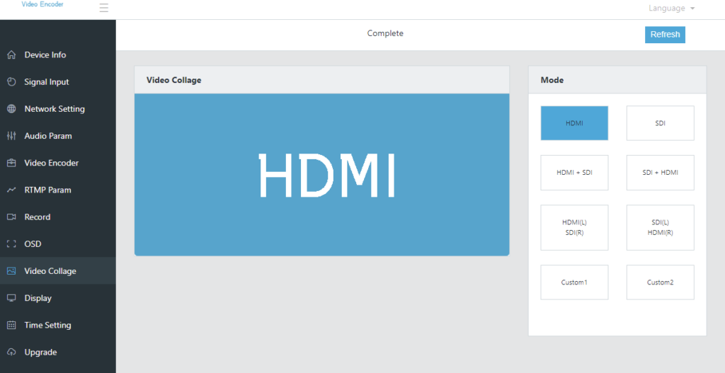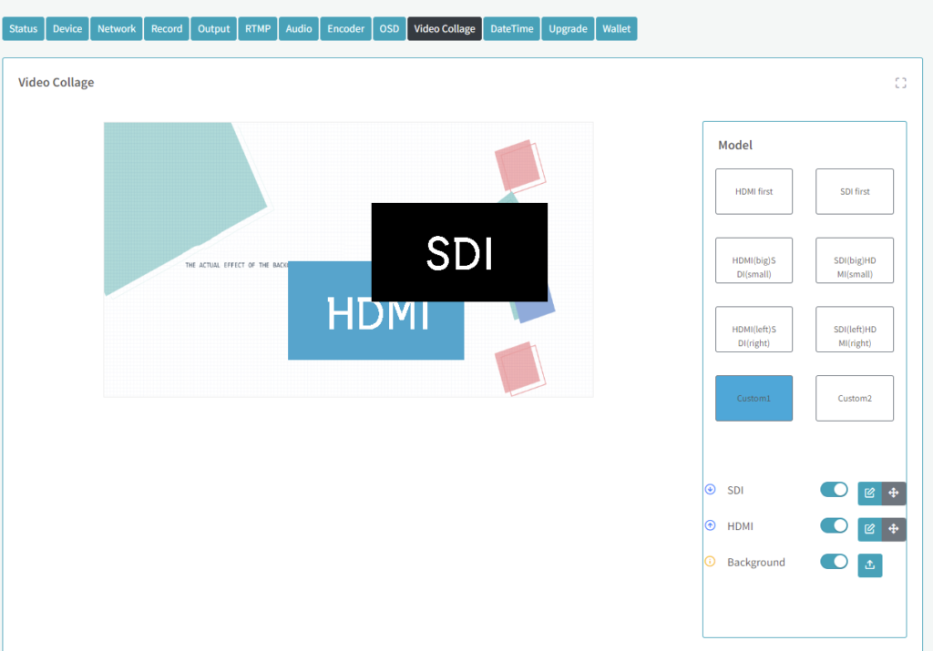 Of course, log in to the web interface, click the “Video Collage” option on the left column of the web control UI, users can choose up to 6 different standard video collages that includes “HDMI FIRST”, “SDI FIRST”, “HDMI (BIG) SDI (SMALL)”, “SDI (BIG) HDMI (SMALL)”, “HDMI (LEFT) SDI (RIGHT)” and “SDI (LEFT) HDMI (RIGHT)”. Furthermore, user can also customize video collage that is “CUSTOM1” and “CUSTOM2”. Once the setting is completed, users can preview the display on the LCD screen immediately.