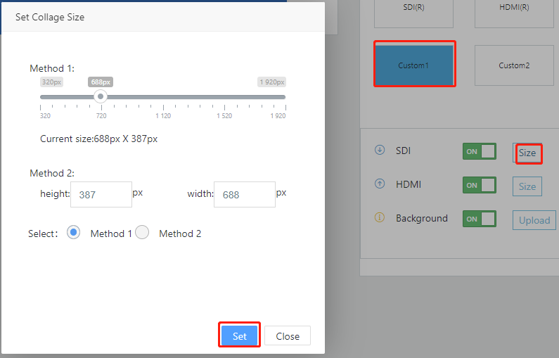 In the case of “CUSTOM1” or “CUSTOM2”, user can customize the size and location of “SDI” and “HDMI” and upload your favorite pictures as background. Users can turn HDMI or SDI on/off via the buttons on the right of “HDMI” and “SDI”. After clicking “Size” button on the right of “HDMI” or “SDI”, the “Set Collage Size” window show as follows, then, the user can change the size of HDMI or SDI. Furthermore, the user can drag-and-drop HDMI and SDI anywhere on the left preview area. Moreover, when HDMI and SDI overlap, the user can select the arrow on the left of the “HDMI” to place the HDMI on the top of bottom layer, the arrow on the left of “SDI” is similar.