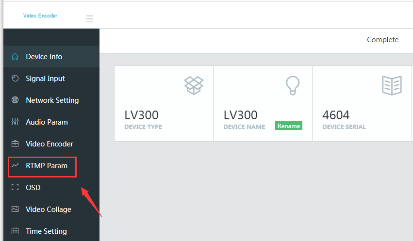 Step 5. After clicking the RTMP Param option on the left column of the web control UI, please fill in RTMP Address and click the Confirm button to apply the setting.