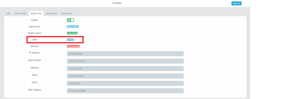 APN setting: After clicking the pen icon in the red mark box on the above picture, turn off APN Auto and fill in APN. Please ask your network operator or search online to find the APN of your 4G LTE network. When the APN setting is changed, don’t forget to restart the device to take effect.