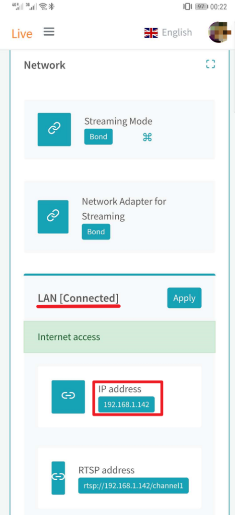 THE LAN IP address of LiveV210 can be found here in the red box, then you can visit this IP in the browser for advanced feature settings once having it. If LAN [Connected] does not show on this screen, that means the encoder does not connect to LAN or the LAN is not online. Please check the connection and Internet.
