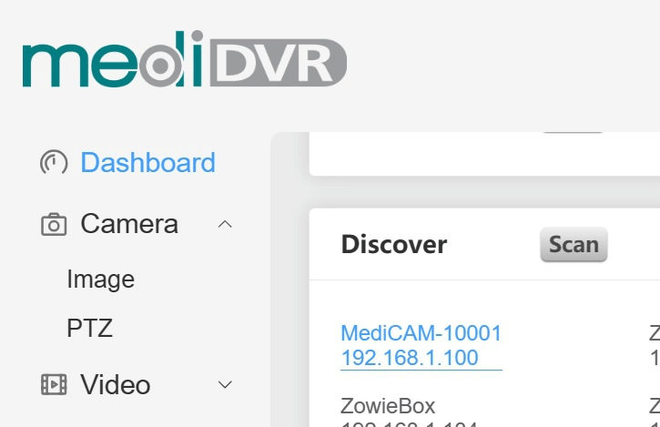 If you already have MediCam or ZowieBox, you can also log in to the new MediCam by device discover, log in to the web control page, and click “Setting->Dashboard” to use the discovery function. After clicking “Scan”, find the serial number of the device that matches with the new MediCam label and click it to the web control interface of the device.