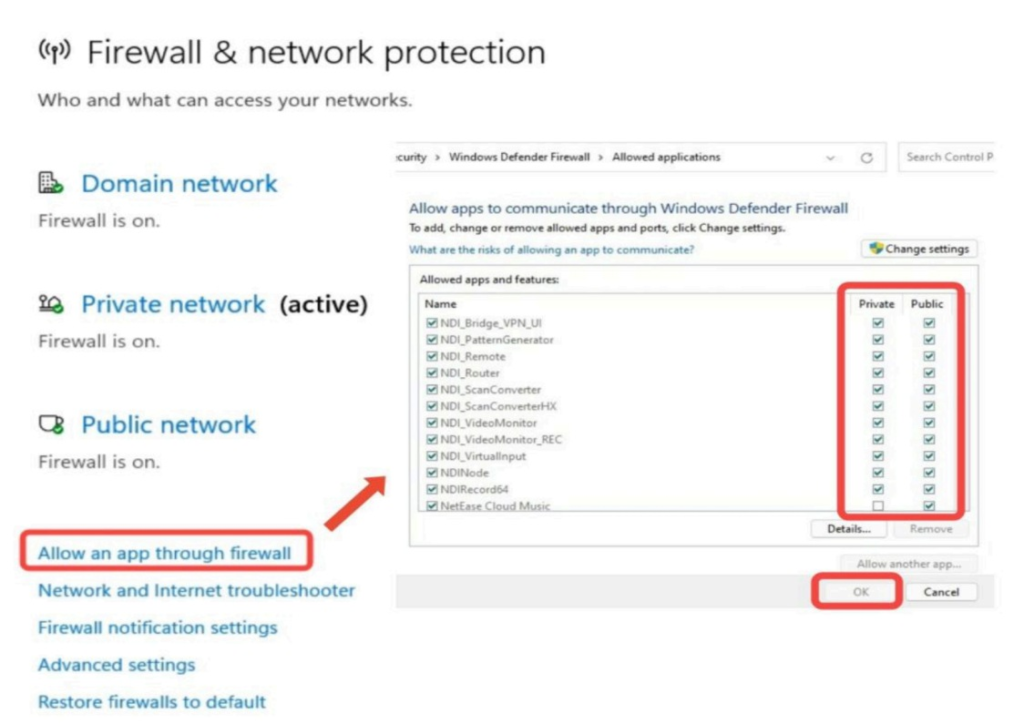 3. Please check whether you are using a private network orpublic network, and check whether all NDI software is allowed to pass through the “Allow an app through the firewall”.