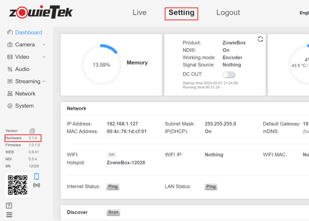 To distinguish New Gen ZowieBox or ZowieBox, please log in to the web control interface and click Setting to view the current hardware version in the lower left corner.