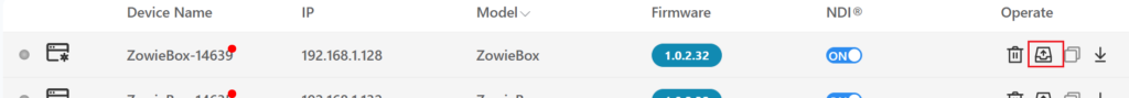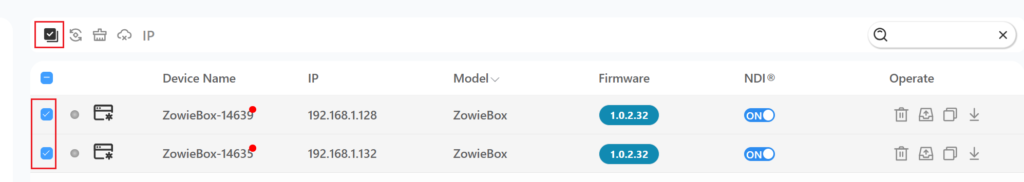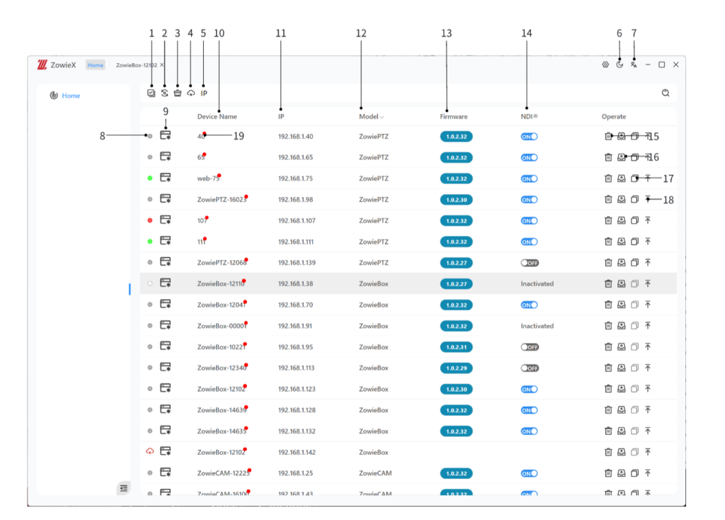 All ZowieTek devices will be automatically discovered by ZowieX and the key information of ZowieTek devices, such as IP, Tally light, NDI activation, firmware version, etc., will be conveniently and clearly displayed.