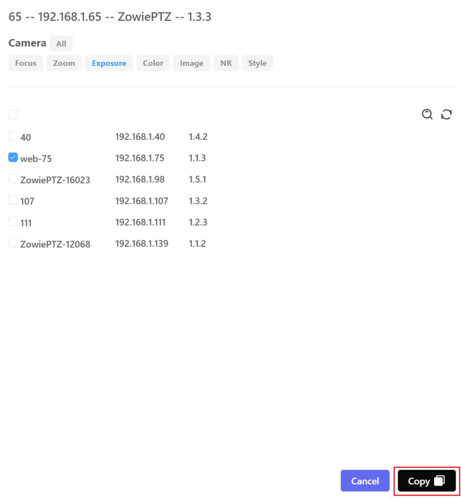 - Select the camera configuration to be copied and the device to be pasted. After the selection is completed, click the copy button in the lower right corner to copy. Currently, only devices of the same model can be copied.