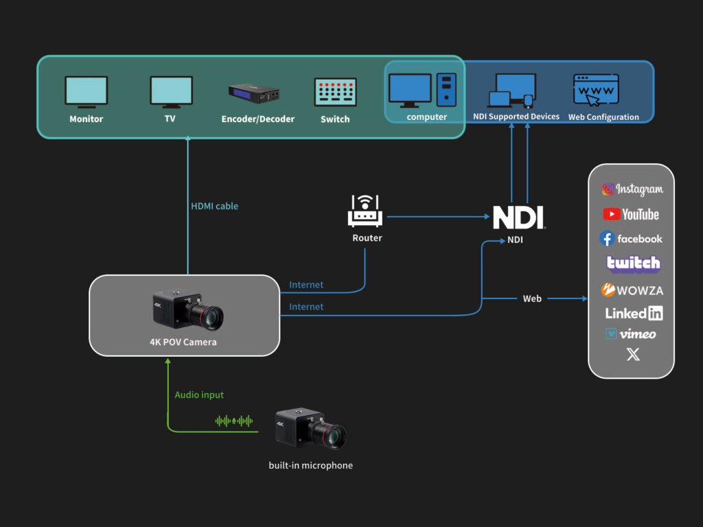 The camera be mounted anywhere. It can also be controlled through an IP web page and integrated into a professional video production system. In addition, a NDI|HX version is also available, which can be directly integrated into your existing NDI system Workflow. While enjoying convenient remote control, you can also smoothly experience the advantages of NDI transmission mode.