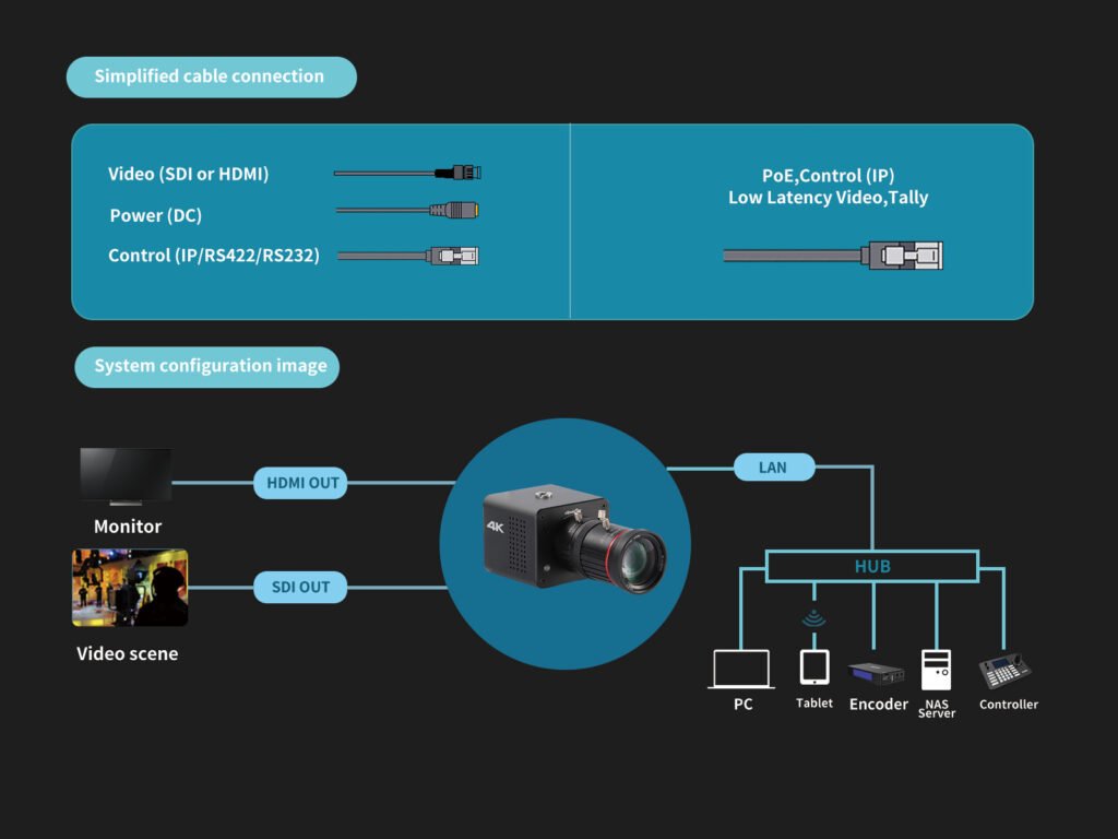 ZowieCam supports PoE power supply and does not require complicated wiring installation. All you need to power your camera is a CAT-5e network cable. Single cable operation that can transfer Video, Audio, Power and Tally.