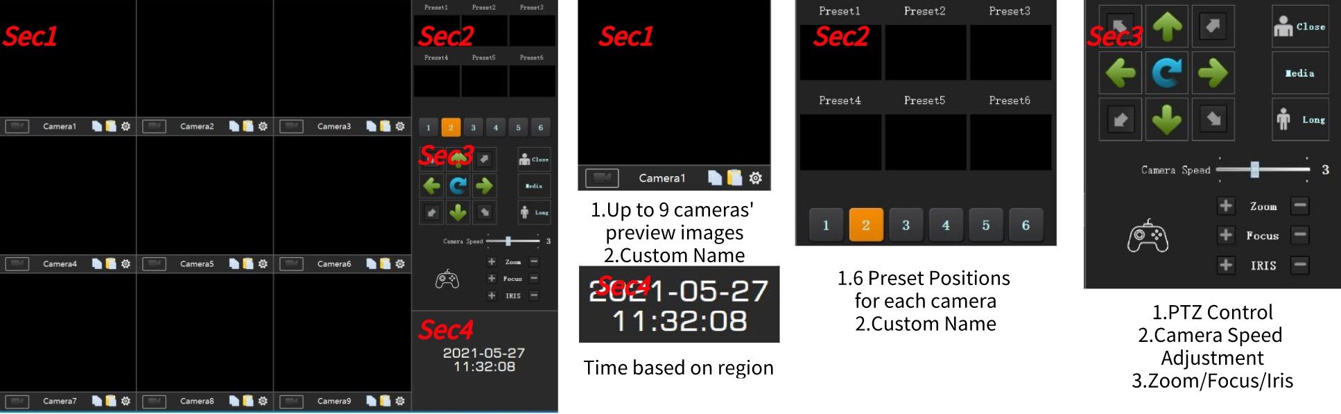 ZowiePTZ APP supports simultaneous previews of 9 cameras, it also supports another option of 4-camera image preview as shown in the right. And with a simple double-click, all the cameras can be altered.