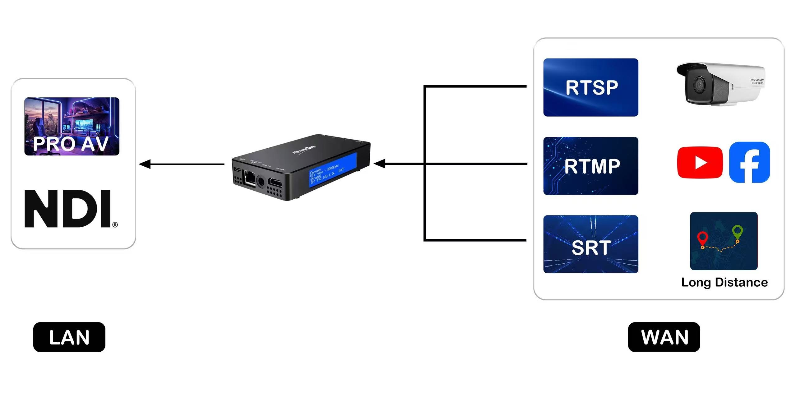 • Flexible Stream Conversion: Seamlessly convert RTSP/RTMP/SRT streams to high-quality NDI for local production.
