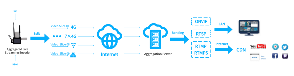 The video streaming from encoder is split into date slice according to Zowietek’s proprietary aggregation protocol, and then transmitted to the aggregation server through multiple 4G LTEs, LAN, and WIFI links. The aggregation server aggregates the split video slices and then bonding them to the specified RTMP(RTMPS)、RTSP or ONVIF. According to the current encoder’s design, up to 7x4G LTE but not limited, 1xLAN, 1xWIFI can be aggregated at the same time, thereby providing extremely reliability and higher bandwidth to meet customer needs.