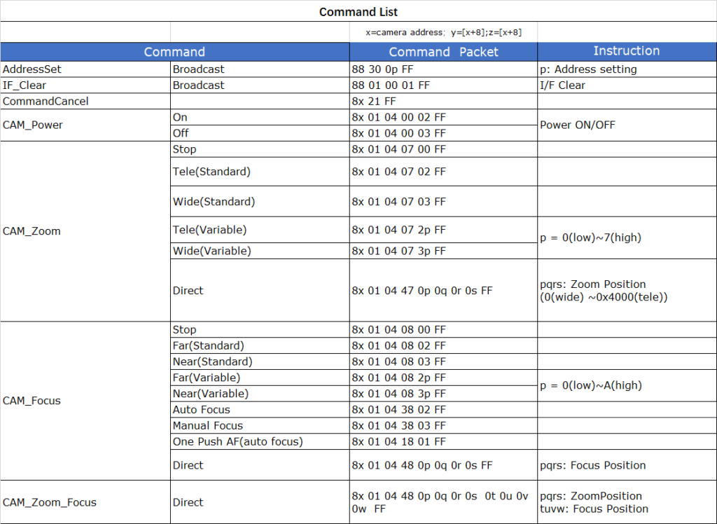 VISCA serial refers to the original implementation of the VISCA protocol, which uses serial communication interfaces such as RS-232 or RS-422 to control video cameras. VISCA serial enables direct, point-to-point communication between a controller device (such as a joystick controller or computer) and the camera, allowing for precise control of camera functions. While VISCA serial provides reliable and low-latency communication, it requires physical connections between devices, limiting the distance over which control commands can be transmitted.